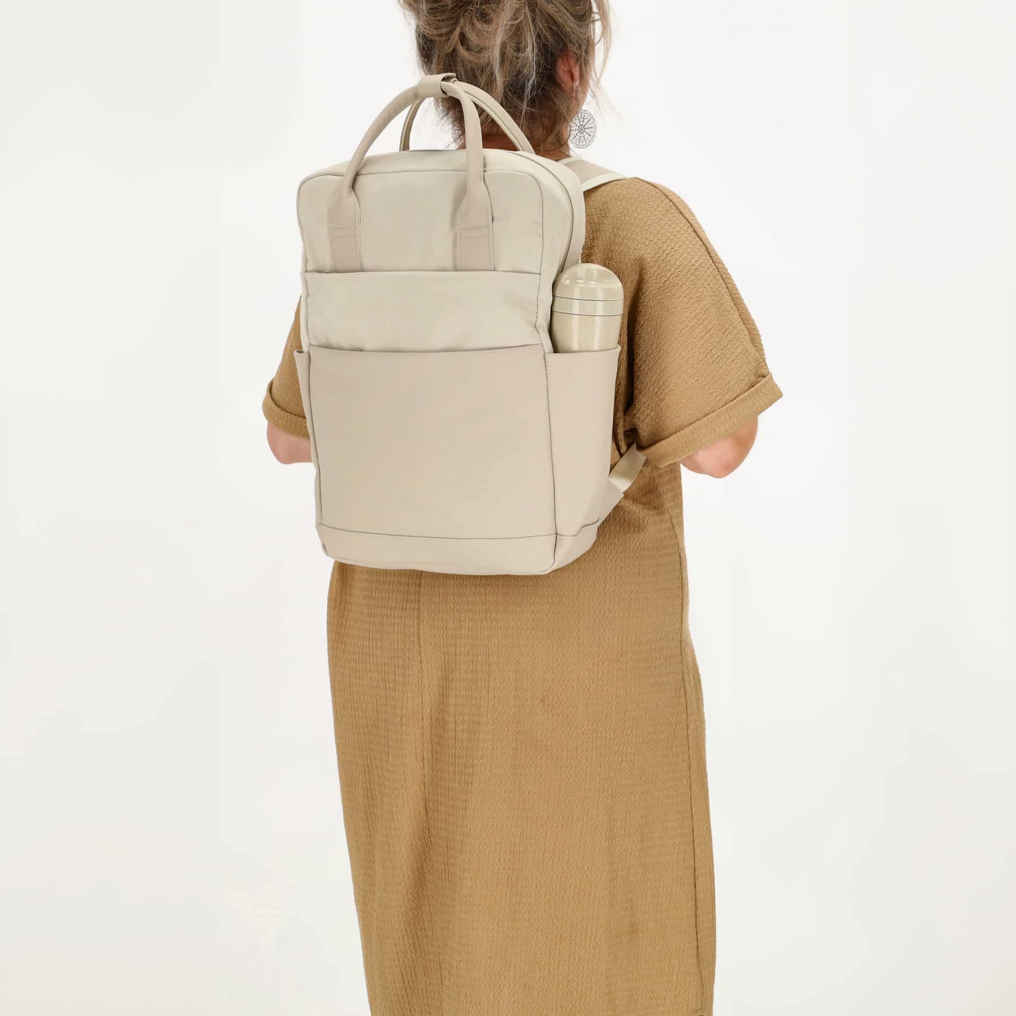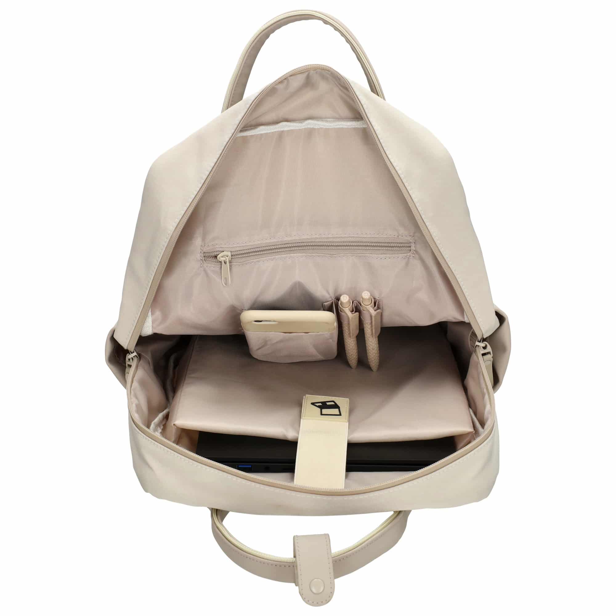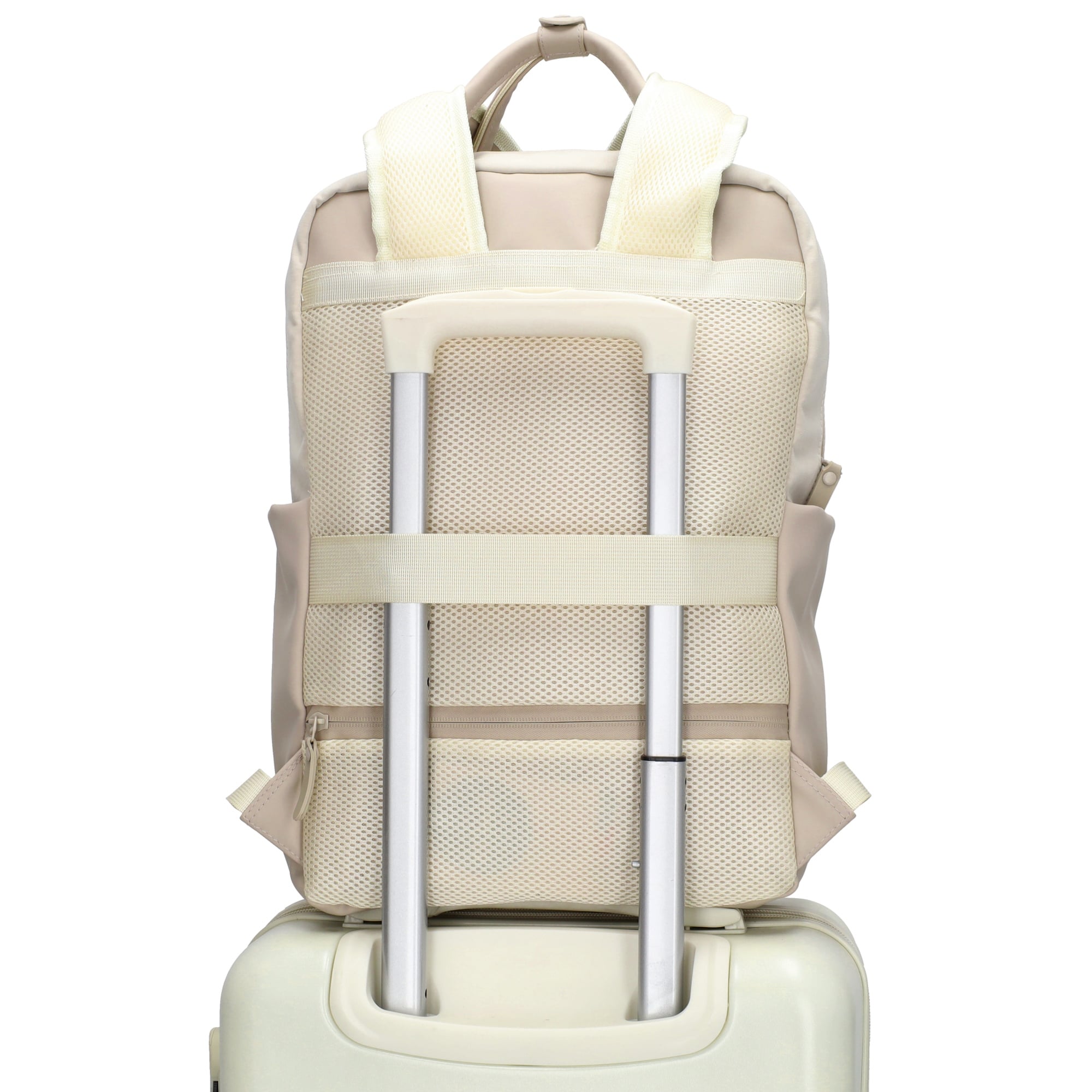 Met de trolleysleeve aan de achterkant kun je de tas eenvoudig op een koffer bevestigen, ideaal voor reizen. De neutrale kleur en het strakke ontwerp maken deze rugzak geschikt voor iedere gelegenheid, terwijl het praktische design zorgt voor comfort en gemak tijdens het dragen.”