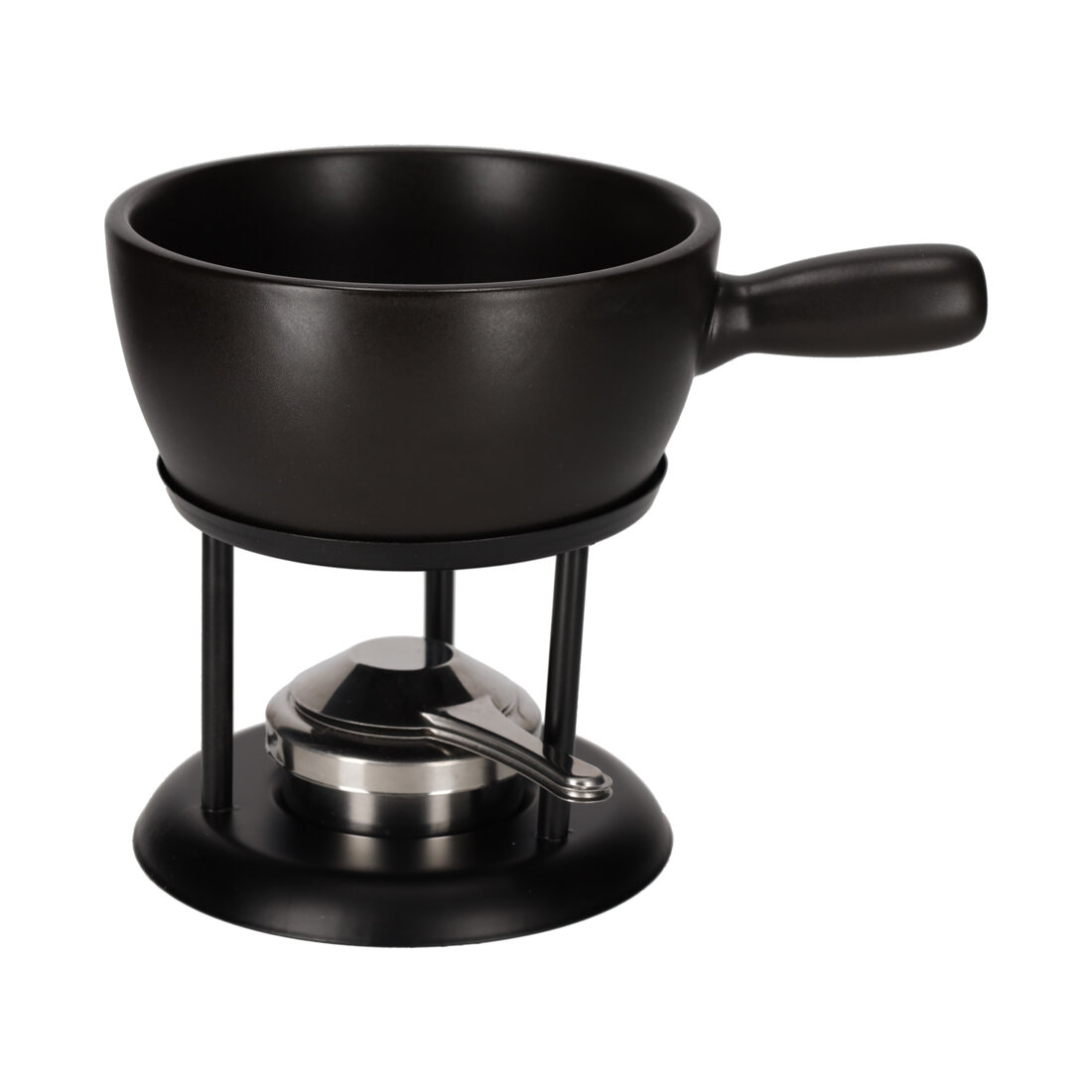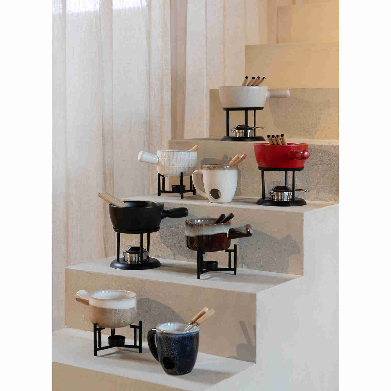 Met deze royale fondueset maak je elk samenzijn extra gezellig. Smelt kaas of chocolade in de meegeleverde keramische pan op het gasfornuis, zet hem daarna op het onderstel en houd de inhoud warm met de fonduebrander. De set wordt geleverd met een ruime pan, vier houten-handvorkjes, een onderstel met brander en doofdeksel, ideaal voor een avond vol smaak en sfeer.