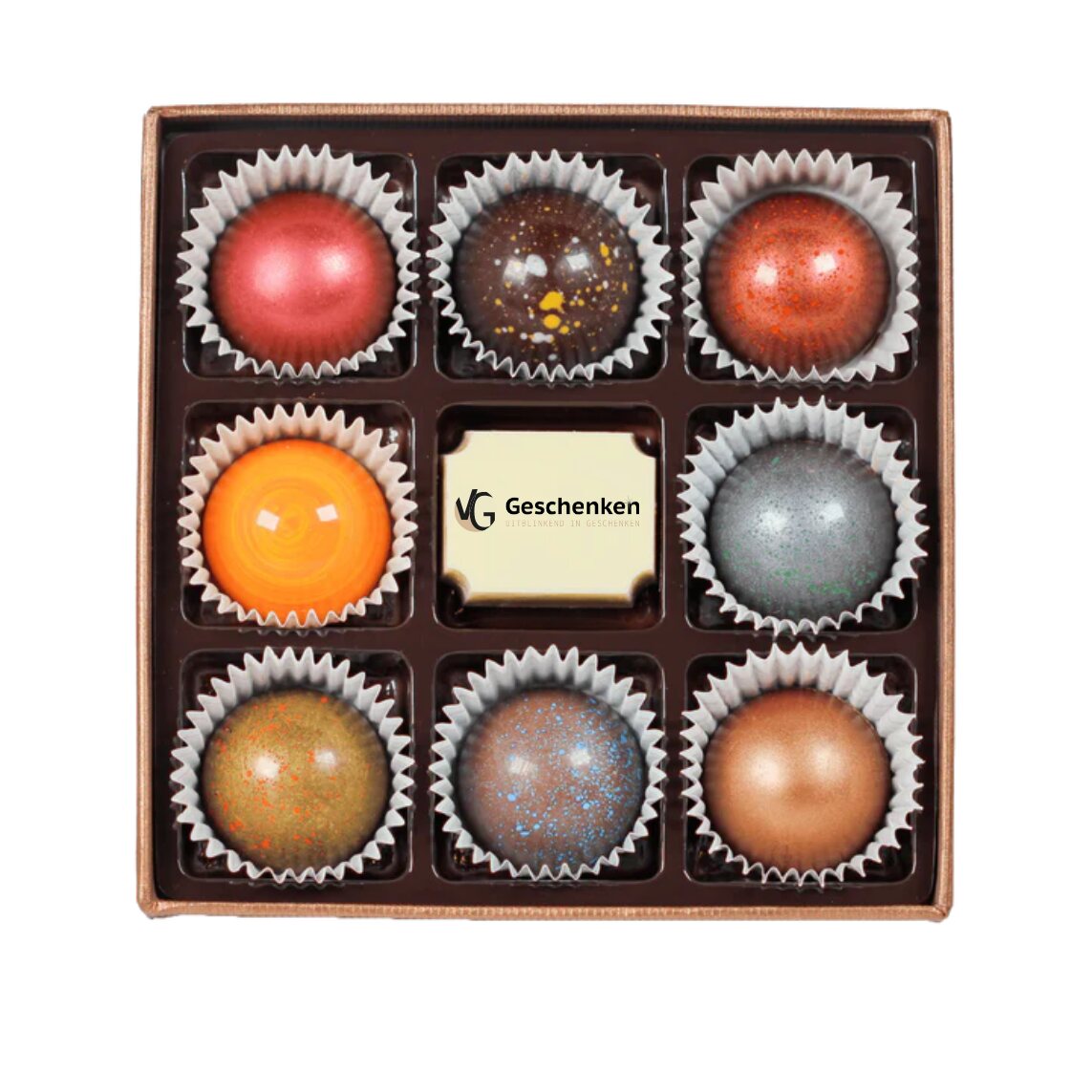 Verras relaties en collega’s met deze elegante bonbons-geschenkdoos, gevuld met 9 ambachtelijke smaken Belgische chocolade. Elke bonbon is met zorg vervaardigd volgens eigen receptuur en biedt een verfijnde smaaksensatie. De stevige, stijlvolle doos is perfect te personaliseren met jouw bedrijfslogo: een subtiel, professioneel gebaar dat blijft hangen. Ideaal als relatiegeschenk, voor evenementen of als attentie bij zakelijke momenten.