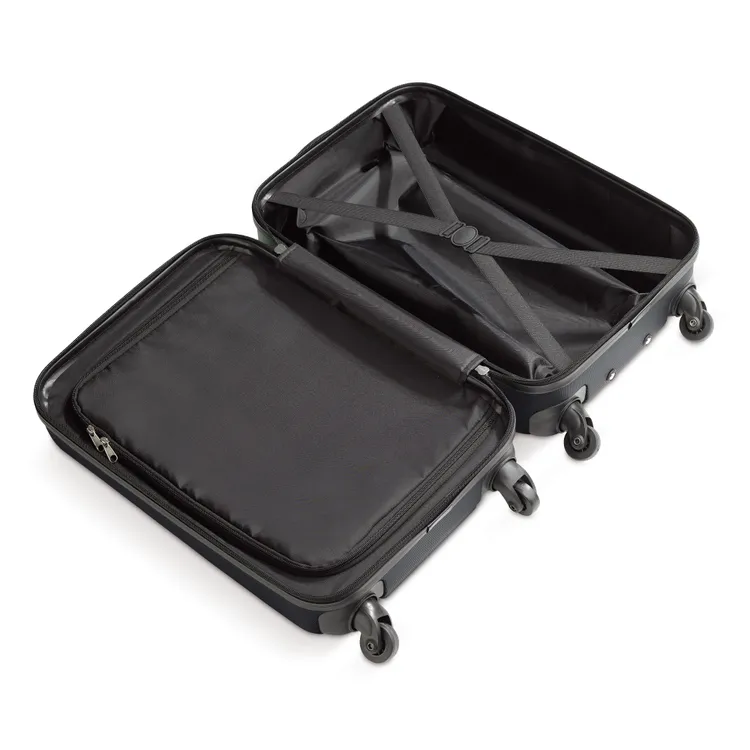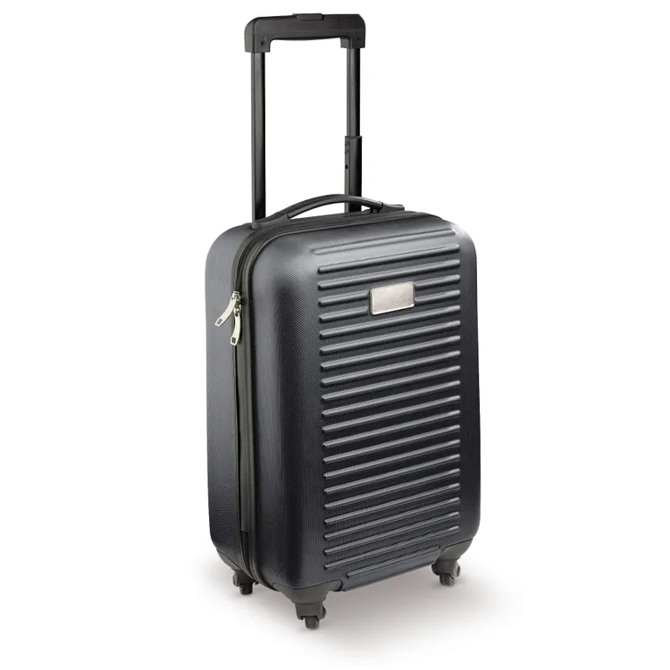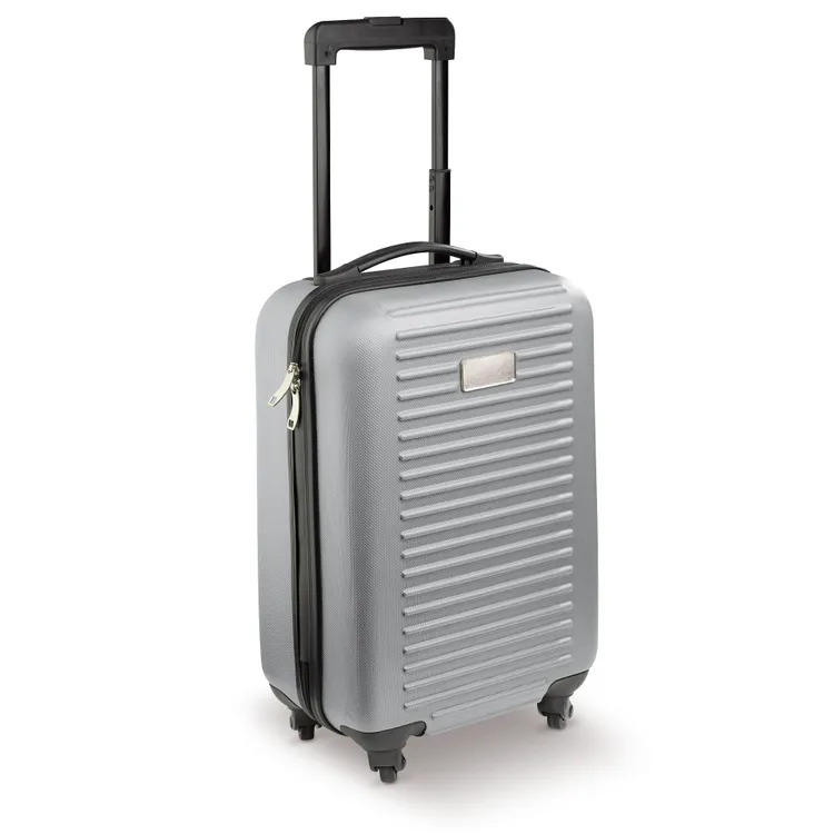 Cabin size trolley met één compartiment met grijze voering en een dubbele rits. De koffer heeft vier zwenkwieltjes en een metalen plaatje voor een bedrukking of gravering. Per stuk in doos verpakt. Een doming is een techniek waarbij een transparante harslaag wordt aangebracht op een oppervlak, zoals een sticker of label, om het te beschermen en een 3D-effect te geven.