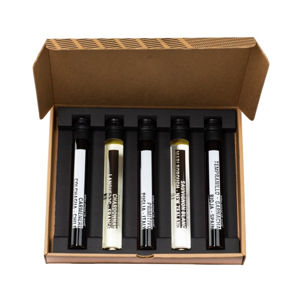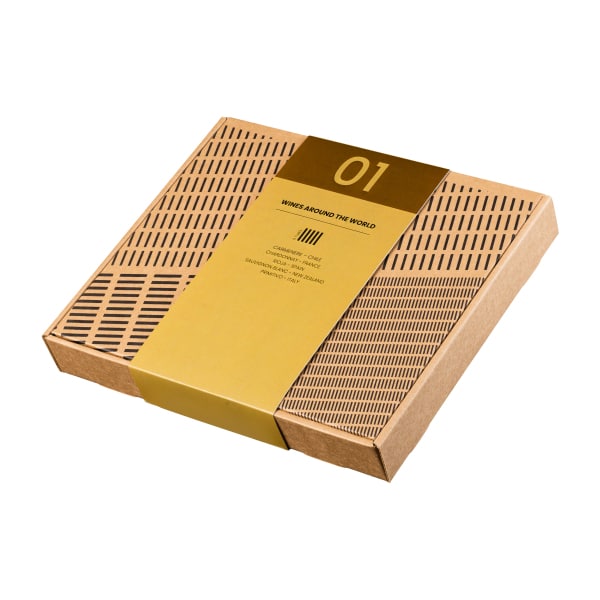 Wijnproeverij in een kraft giftbox bestaande uit 5 glazen 100 ML tubes met verschillende wijnen uit Frankrijk (14% vol), Chili (13,5% vol), Spanje (13% vol), Italië (14% vol) en Nieuw-Zeeland (12% vol).